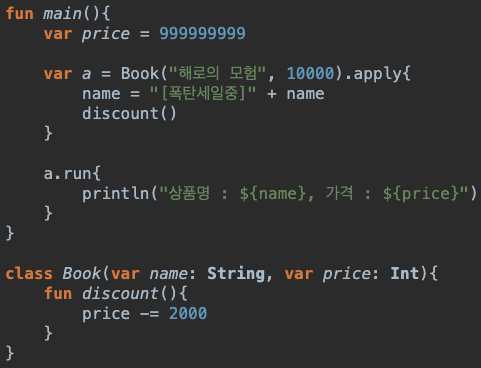 아래 예제에서는 run 스코프 내에서, 위 예제에서 a 라는 Book 인스턴스를 생성할 때 discount() 를 통해 할인을 적용했었기 때문에